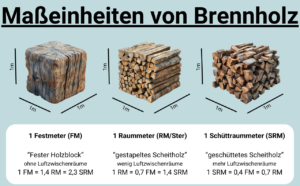 Brennholz auf Paletten wird meist nach Volumen verkauft, üblicherweise in Raummetern (RM) oder Ster. Ein Raummeter entspricht einem Kubikmeter gestapeltem Holz, inklusive der Luftzwischenräume. Die Größe und das Gewicht der Palette hängen von der Holzart, der Scheitgröße und der Stapeldichte ab.